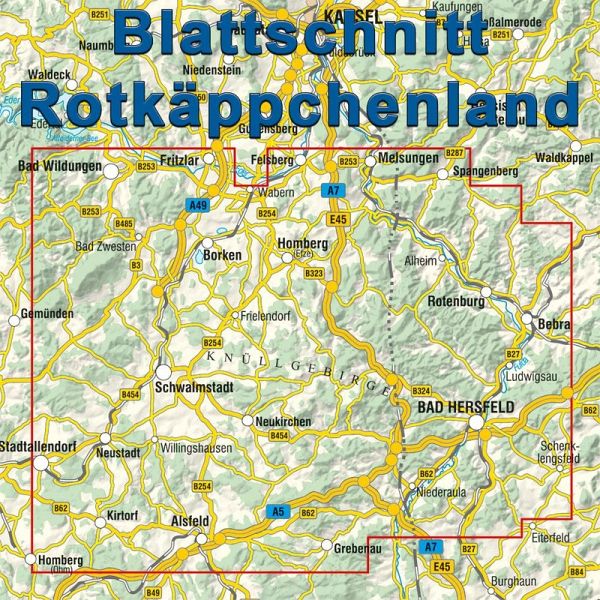 Riesige Wälder, grüne Wiesen und sanfte Hügel prägen das "Rotkäppchenland" zwischen Schwalm, Knüll und dem Kellerwald.Über 1 700 km gepflegte und markierte Wanderwege durchziehen die märchenhafte Landschaft. Aussichtstürme auf dem Eisenberg, dem Knüllköpfchen und der Mengshäuser Kuppe bieten großartige Ausblicke und sind ein lohnendes Ziel für eine Wanderung.Eine Vielzahl von Radwegen wie der Bahnradweg, der Schwalm-Radweg oder der Schwalm-Efze-Radweg laden zu ausgedehnten Radtouren ein.Die neue reiß- und wetterfeste Rad- und Wanderkarte "Rotkäppchenland" stellt im Maßstab 1:50 000 die Region Rotkäppchenland von Schwalmstadt bis Bad Hersfeld und von Alsfeld bis zum Kellerwald mit dem vollständigen Rad- und Wanderwegenetz vor.Ein integriertes UTM-Gitter ermöglicht die Orientierung im Gelände mit Hilfe eines GPS- Gerätes und eine Geländeschummerung visualisiert das Mittelgebirge.
