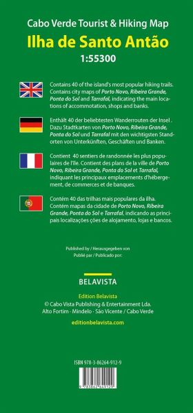 Enthält 40 der beliebtesten Wanderrouten der Insel. Dazu Stadtkarten von Porto Novo, Ribeira Grande, Ponta do Sol und Tarrafal mit den wichtigsten Standorten von Unterkünften, Geschäften und Banken.Contains 40 of the island's most popular hiking trails. Contains city maps of Porto Novo, Ribeira Grande, Ponta do Sol and Tarrafal, indicating the main locations of accommotation, shops and banks.Contient 40 sentiers de randonnée les plus populaires de l'île. Contient des plans de la ville de Porto Novo, Ribeira Grande, Ponta do Sol et Tarrafal, indiquant les principaux emplacements d'hébergement, de commerces et de banques.Contém 40 das trilhas mais populares da ilha. Contém mapas da cidade de Porto Novo, Ribeira Grande, Ponta do Sol e Tarrafal, indicando as principais localizações ções de alojamento, lojas e bancos.Sprachen: Deutsch, Englisch, Französisch, Portugiesisch