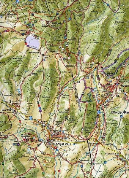 Bereits der Titel verrät die touristische Entwicklung in der Region rund um dem markanten Gipfel des Bleßberges, in dessen Folge der Blattschnitt der bisherigen Karte "Bleßberg, Eisfeld" etwas nach Süden verschoben und im Osten erweitert wurde. Das Kartenblatt stellt das Wandergebiet zwischen Rennsteig und dem Coburger Land dar und reicht von Waffenrod-Hinterrod, Friedrichshöhe und Lauscha im Norden bis zur Senningshöhe, dem Froschgrundsee und nach Sonneberg im Süden. Das "Schaumberger Land" ist eine aufstrebende Tourismusregion, in der in den letzten Jahren sehr viel in die Entwicklung der touristischen Infrastruktur investiert wurde - so entstanden hier interessante museale Ausstellungen bzw. wurden vorhandene erweitert und für den sportlich ambitionierten Gast entstand eine Vielzahl interessanter Wanderwege, Lehrpfade und Nordic-Walking-Strecken als auch ein ganzes Netz an ausgewiesenen Radwanderrouten. All dies widerspiegelt sich in der neuen Wanderkarte Die Wanderkarte wurdenach geographischen, landschaftlichen und touristischen Aspekten erarbeitet. Sie ist das Blatt Nr. 17 der großen Wanderkartenserie "Naturpark Thüringer Wald". Der Blattschnitt stellt in der Mitte die Stadt Schalkau als das Zentrum des "Schaumberger Landes" sowie etwas nördlich den Titel gebenden Bleßberg dar und reicht vom Rennsteig bei Friedrichshöhe und Limbach bis in die nördlichen Ausläufer des Frankenwaldes bzw. Coburger Landes. Der Maßstab von 1:30.000 gibt Raum für eine hohe Genauigkeit und Detailtreue. Neben der exakten Wegezeichnung von Wanderwegen, gespurten Skiwegen, Reitwegen und Radrouten sind Besonderheiten der Landschaft, Höhenangaben und Naturschutzgebiete eingetragen. Wanderwege, alte