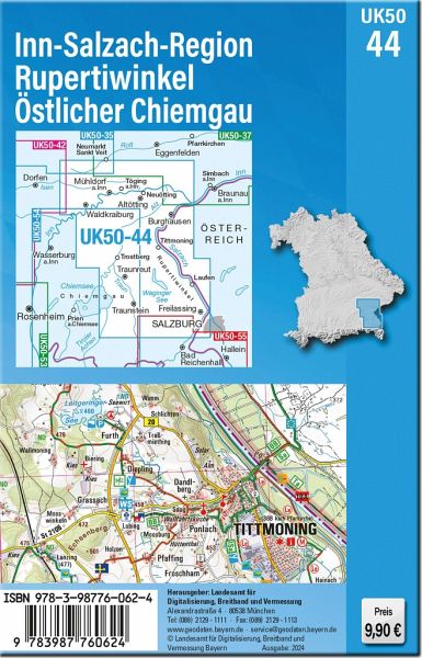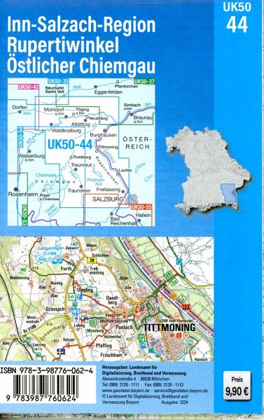 Die amtliche Reihe der UK50 (Umgebungskarte 1:50000) bietet für zusammenhängende bayerische Regionen gezielte Freizeitinformationen.Kartengrundlage ist die TK50 (Topographische Karte 1:50000) mit UTM-Gitter für GPS-Nutzer und Geländedarstellung.Die UK50-44 präsentiert drei überregional bedeutende Regionen: Die Inn-Salzach-Region mit der längsten Burg der Welt (1000m) in Burghausen, dem Wallfahrtsort Altötting und dem schönen Stadtplatz in Mühldorf a.Inn - Den Rupertiwinkel zwischen Alz im Norden und Chiemgauer Alpen im Süden sowie der deutsch-österreichische Grenze im Osten und nahe der Traun im Westen - Den östlichen Chiemgau, das Gebiet rund um den Chiemsee bis zum Rupertiwinkel.Die Radwege entlang der Flüsse Inn, Alz, Traun oder Salzach ermöglichen entspannte Touren, um die Moränenlandschaft mit ihren zahlreichen Tälern zu erkunden. Wer sportlichere Touren bevorzugt radelt den Bodensee-Königssee-Radweg oder den Panoramaweg Inn-Salzach. Optimale Bedingungen für Familienradtouren bietet der Rupertiwinkel mit dem wärmsten Badesee in Bayern - dem Waginger See. MTB-Fahrer verschlägt es in den Süden des Kartenbilds. Die Regionen Chiemgauer Alpen und Berchtesgadener Land pflegen für sie hervorragende Strecken. Fußpilger empfiehlt sich der Wolfgangweg mit Etappenstopp in Altötting. Jener führt im Kartenbild von Neumarkt-St.Veit über Burghausen weiter nach Österreich. Schöne Tagestouren lassen sich rund um den Chiemsee, Traunstein und Siegsdorf planen.Wer nach einer anspruchsvollen Wanderung bei Ruhpolding Rast sucht, dem empfiehlt sich das Erlebnisbad Vita Alpina. Weitere tolle Ausflugsziele sind die Lokwelt in Freilassing, das Traumwerk in Anger und die malerische Salzachschleife bei Laufen. Geschichtlich Interessierte verschlägt es in die Umgebung von Seebruck am Chiemsee. Dort kann man an zahlreichen Orten in die Kelten und Römerzeit abtauchen.Kartenblatt UK50-44 Inn-Salzach-Region, Rupertiwinkel, Östlicher ChiemgauREGIONEN: Oberbayern, Rupertiwinkel, Chiemgau, Chiemgauer Alpen, Isental ORTE: Waldkraiburg, Traunstein, Burghausen, Mühldorf a.Inn, Altötting, Neuötting, Traunreut, Waging a.See, Ampfing, Ruhpolding, Teisendorf