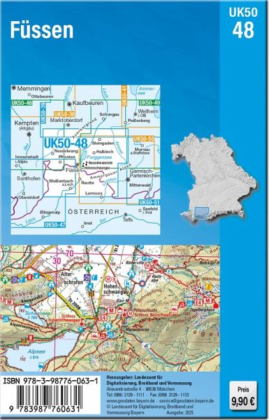 Die amtliche Reihe der UK50 (Umgebungskarte 1:50000) bietet für zusammenhängenden bayerische Regionen gezielte Freizeitinformationen.Kartengrundlage ist die TK50 (Topographische Karte 1:50000) mit UTM-Gitter für GPS-Nutzer und Geländedarstellung.Im Mittelpunkt des Kartenbildes der UK50-48 liegt Füssen mit dem Forggensee und dem weltberühmten Schloss Neuschwanstein. Im Osten wird das Gebiet vom südlichen Pfaffenwinkel über die Ammergauer Alpen bis hin zur Zugspitzte abgebildet. Das südöstliche Allgäu, die Tannheimer Berge und ein Teil der Allgäuer Alpen präsentieren sich im Westen. In Österreich beginnen der Naturpark Tiroler Lech und die Lechtaler Alpen.Radler erleben entlang des Lechradwegs den letzten Wildfluss der Nordalpen und genießen ein unvergessliches Alpenpanorama. Das wohl "schönste Hochtal Europas" - das Tannheimer Tal - mit herrlichen Seen kann auf den örtlichen Wegen einwandfrei umrundet werden. Schöne Tagestouren mit touristischen Highlights wie dem AlpspitzKICK (längste Zipline Deutschlands) lassen sich rund um Nesselwang, Pfronten und dem Grüntensee planen. Die abwechslungsreichen Ammergauer Alpen locken Mountainbiker zu spannenden Etappen. Leichte Wege und sanfte Berge beschreiben den Verlauf der MTB-Touren im Allgäu und in Tirol zum Naturbiken. Wanderfreunde können die gesamte Region perfekt auf den beschilderten Wegen des Deutschen Alpenvereins entdecken. "Drei Routen, drei Höhenlagen" lautet das Motto der Wandertrilogie Allgäu. Hier ist für alle die passende Tour dabei, um das Allgäu auf sich wirken zu lassen. Wer es gerne etwas langsamer angeht unternimmt einen Ausflug zu einem der schönsten Spazierwege Bayerns, dem Eibsee-Rundweg mit anschließender Fahrt auf die Zugspitze.Ein Highlight jagd das Nächste: das Schloss Hohenschwangau, die Altstadt von Füssen mit Kloster und Hohem Schloss, der Lechfall mit Walderlebniszentrum, der Forggensee mit sommerlicher Schifffahrt und dem Festspielhaus sowie das Schloss Linderhof sind Ziele für Jungund Alt. Spaß und Action gibt es in einem der vielen Hochseilgärten und auf den Sommerrodelbahnen der Region.Das Kartenblatt UK50-48 FüssenREGIONEN: Schwaben, Oberbayern, Tirol, Allgäu, Allgäuer Alpen, Ammergauer Alpen, Tannheimer Berge, Lechrain, Pfaffenwinkel, Lechtaler Alpen, ForggenseeORTE: Füssen, Pfronten, Reutte, Nesselwang, Halblech, Steingaden, Neuschwanstein, Hohenschwangau, südl. Auerbergland, Oberammergau, Oy-Mittelberg