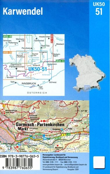 Die amtliche Reihe der UK50 (Umgebungskarte 1:50000) bietet für zusammenhängenden bayerische Regionen gezielte Freizeitinformationen. Kartengrundlage ist die TK50 (Topographische Karte 1:50000) mit UTM-Gitter für GPS-Nutzer und Geländedarstellung.In der UK50-51 wird das gesamte bayerische Karwendel und ein Großteil des Tiroler Karwendels abgebildet. Im Norden der Karte dominieren große Gewässer: Staffelsee, Kochelsee, Walchensee und Sylvensteinsee. Zudem warten das Estergebirge, die Jachenau, das Werdenfelser Land, der östliche Teil des Wettersteingebirges, die Kocheler Berge, der Isarwinkel und das Murnauer Moos auf Entdeckung.Radler erreichen über den Isarradweg den Ursprung von Bayerns viertgrößtem Fluss inmitten des Karwendelgebirges am Hochplateau der Region Seefeld. Die Kunstschleife passiert den Wagenbrüchsee, den Walchensee mit dem Filmkulissendorf FLAKE und das Brauneck bei Lenggries. Der Loisach-Radweg führt in dieser Region von Garmisch-Partenkirchen vorbei am Estergebirge bis hin nach Murnau a.Staffelsee. Eine Vielzahl an weiteren Radwegen ermöglichen wunderbare Tagestouren für die ganze Familie. MTB-Fans können auf einem großen Netz von ausgeschilderten Wegen die Berge und ihr Umland erforschen.Wanderer erreichen das Königshaus am Schachen und den Botanischen Alpengarten über den Spitzenwanderweg und die Via Alpina. Die Gegend von Mittenwald bis hin nach Garmisch-Partenkirchen bietet mit sanften Erhebungen wie dem Kranzberg, den Buckelwiesen und vielen kleinen Seen schöne Touren für Genusswanderer. Die Wege des Deutschen Alpenvereins ermöglichen die Planung individueller Wanderungen für jeden.Die Partnachklamm gehört zu den Höhepunkten rund um Garmisch-Partenkirchen. Deutschlands höchst gelegenes Museum in einem Riesenfernrohr an der Bergstation der Karwendelbahn informiert über das alpine Ökosystem. Entspannung oder Spaß für die Kleinen gibt's in einem der Erlebnisbäder der Region wie dem Alpspitz-Wellenbad in Garmisch-Partenkirchen oder derIsarwelle in Lenggries. Unvergessliche Blicke auf die Alpen genießt man bei einer Schifffahrt auf dem Achensee.Das Kartenblatt UK50-51 KarwendelREGIONEN: Oberbayern, Tirol, Karwendel, Bayerisches Oberland, Werdenfelser Land, Wettersteingebirge, Estergebirge, Ammergauer Alpen, Murnauer Moos, Isarwinkel, Kocheler Berge, Jachenau, Mangfallgebirge, Kochelsee, Walchensee, Sylvensteinsee, AchenseeORTE: Garmisch-Partenkirchen, Lenggries, Murnau a.Staffelsee, Mittenwald, Kochel a.See, Benediktbeuern