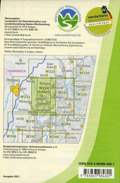 W234 AchernMaßstab 1:25 000 Gebiet:Ottersweier, Achern, Sasbach, Sasbachwalden, Lauf, Renchen, Kappelrodeck, Seebach, Ottenhöfen, Appenweier, Oberkirch, Lautenbach, Offenburg, Durbach, Oppenau, Ortenberg, Ohlsbach, Gengenbach, Berghaupten, Nordrach, Bad Peterstal-GriesbachInhaltIm idealen Maßstab von 1:25 000 enthält die Wanderkarte alle in diesem Bereich vorkommenden Wanderwege des Schwarzwaldvereins wie den Westweg, den Renchtal- und Seensteig und viele andere mehr. Jakobuswege und zahlreiche Erlebniswege ergänzen den Karteninhalt. Als Qualitätswanderwege "Wanderbares Deutschland" zertifizierte Wege wurden entsprechend gekennzeichnet. Die Ortenau-Vorberge am Westrand des Schwarzwalds mit ihren malerischen Obst- und Weinanbaugebieten, der bergige Nördliche Talschwarzwald bis hin zum Grindenschwarzwald mit der Hornisgrinde als höchster Erhebung des Nordschwarzwalds und dem Mummelsee sowie unzähligen Gewässerläufen bieten nahezu unerschöpfliche Wandermöglichkeiten mit vielen einfachen oder anspruchsvolleren Auf- und Abstiegen und Aussichtspunkten. Die Besichtigungsmöglichkeiten kleinerer und größerer Ortskerne runden das Angebot ab. Die Karte enthält touristische Informationen wie beispielsweise Aussichtspunkte, Schutzhütten, Grillplätze, Sehenswürdigkeiten, Wanderheime und Gasthäuser in Auswahl. Außerdem Bahnhöfe, Haltestellen sowie besonders gekennzeichnete touristische Objekte und vieles mehr.Zur besseren Orientierung sind Wanderwegweiser mit ihren Namen und das UTM-Gitter wiedergegeben.Die Größe des Maßstabs ermöglicht einen detaillierten Überblick über das ausgewählte Gebiet. Karte des SchwarzwaldvereinsFormate und Lieferarten:96,7 X 66,5 (nur gefaltet auf 10,9 X 16,8 cm lieferbar)ISBN:978-3-86398-460-1Ausgabe:2021Herausgeber:Landesamt für Geoinformation und Landentwicklung Baden-Württemberg