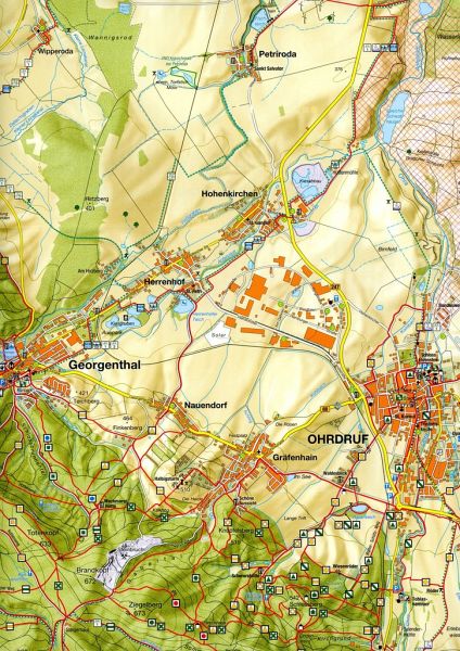 "Ohrdruf und Ohratalsperre" ist der Titel für eine neue Karte, welche der touristischen Entwicklung der letzten Jahre in dieser Region zwischen Rennsteig und Thüringer Becken Rechnung trägt. Die Karte stellt das Wandergebiet rund um Ohrdruf und die landschaftlich reizvoll gelegenen Stauseen von Ohratalsperre, Schmalwassertalsperre, Tambacher Talsperre und Lütschetalsperre dar. Der Kartenblattschnitt reicht von Gotha-Boxberg und Wechmar im Norden bis zum Wachsenrasen am Rennsteig und Geschwenda im Süden. Das Kartenbild widerspiegelt hier sowohl eine gewachsene Tourismusregion als auch ein Gebiet, dass sich noch in den Anfängen der touristischen Entwicklung befindet. Eine gelungene Mischung - während man neben den reizvollen Talsperrenlandschaften in zahlreichen Orten auf den Spuren der Geschichte, von berühmten Persönlichkeiten, wie Bonifatius und Johann Sebastian Bach, oder der Technik im Tobiashammer und der Lohmühle wandeln kann, erwarten den Besucher hier auch weniger berührte Gebiete zur Erholung und Entspannung. Ganz prägnant für diese Region sind die in den letzten Jahren entstandenen Weideflächen für besondere Weidetiere, wie Auerochsen, Schottische Hochlandrinder, Wildpferde u. a.Die Wanderkarte wurde nach geographischen, landschaftlichen und touristischen Aspekten erarbeitet. Sie ist das Blatt Nr. 4 der großen Wanderkartenserie "Naturpark Thüringer Wald". Der Blattschnitt stellt in der Mitte die Stadt Ohrdruf dar und reicht vom Rennsteig und dem Nordhang des Thüringer Waldes bis in das Gothaer Vorland - dem südwestlichen Rand des Thüringer Beckens. Der Maßstab von 1:30.000 gibt Raum für eine hohe Genauigkeit und Detailtreue. Neben der exakten Wegezeichnung von Wanderwegen, gespurten Skiwegen, Reitwegen und Radrouten sind Besonderheiten der Landschaft, Höhenangaben und Naturschutzgebiete eingetragen. Wanderwege, alte Flurnamen, Bekanntes und Geheimtipps - all das findet sich auf der topographischen Karte wieder. Auf der Kartenrückseite geben kurze Erläuterungen Auskunft über die Orte und deren historische Entwicklung. Fotos zeigen Sehenswürdigkeiten und konkrete Wandervorschläge machen Lust auf einen Besuch. Durch das handliche Format (48 x 68 cm) und das spezielle Landkartenpapier nehmen Wanderer die Karten aus dieser Serie gerne mit auf Wanderschaft.
