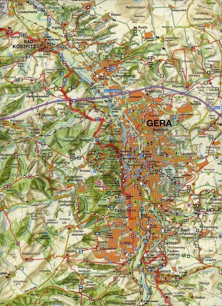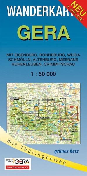 Gera und Ronneburg waren Gastgeber der Bundesgartenschau 2007 - beide Städte liegen im Zentrum der topographischen Wanderkarte (Maßstab 1: 50.000). Der Kartenausschnitt umfasst die touristischen Regionen Thüringens östlich der A 9 und reicht bis zur Skatstadt Altenburg und den sächsischen Städten Meerane, Crimmitschau und Werdau. Sie enthält die exakte Wegezeichnung der Wanderwege und Radwanderrouten, Angaben zu touristischen Besonderheiten und Angeboten. Die farbig bebilderte Kartenrückseite enthält eine Vielzahl von Wandervorschlägen und gibt Informationen zu den Orten. Die Karte wurde auf speziellen Landkartenpapier gedruckt