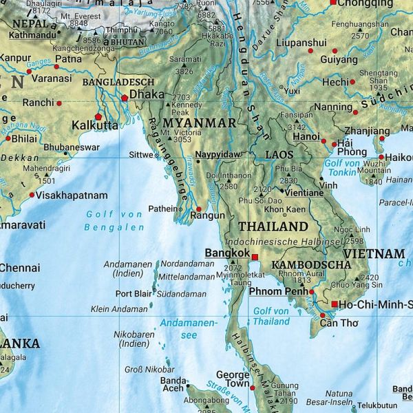 Informationen zur Weltkarte XXL Maßstab 1:15.000.000 | Beschriftung: deutsch | Physisches Kartenbild | Brilliante Farbgebung | Format: 190 x 135 cm