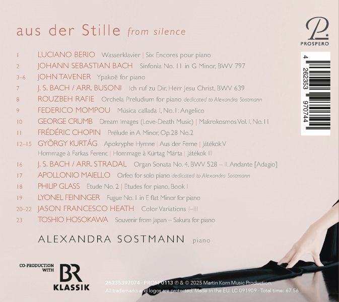 Die Pianistin Alexandra Sostmann wird nicht nur für ihr ausgefeiltes Bach-Spiel gepriesen, sondern ist auch bekannt für Konzert- und CD-Programme, die Entwicklungen und Querverbindungen in der Musikgeschichte nachspüren. Auf ihrem Album ...aus der Stille bei PROSPERO spannt sie den Bogen vom Barock bis zur Gegenwart und fasziniert mit den sich in der Musik spiegelnden Wandlungen und Übergängen.
