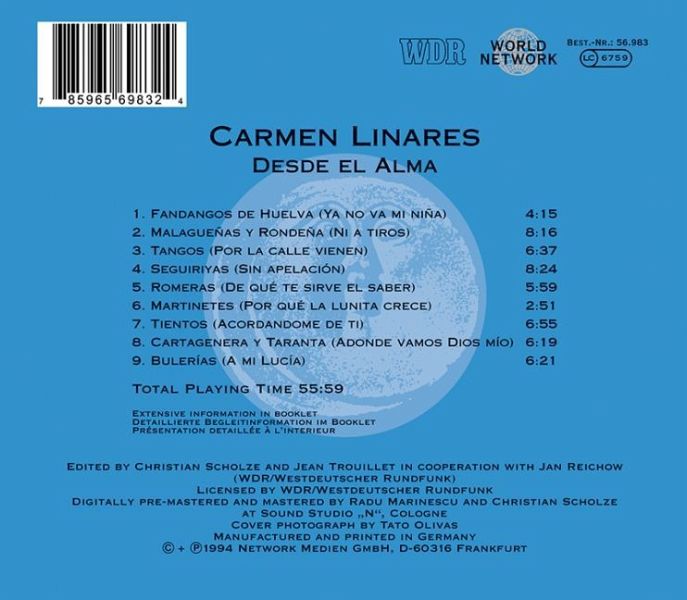In Spanien nennt man Carmen Linares die Königin des Gesangs, sie hat den ersten Preis des Arte Flamenco und andere wichtige Wettbewerbe gewonnen. Mit einer Stimme, die ausdrucksstark wie keine zweite vor Leidenschaft vibriert, führt sie uns große Momente des Cante Flamenco vor.