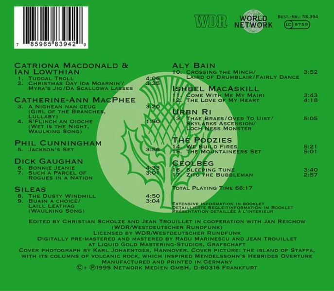 Eine Reise in die verschiedensten lebendigen Traditionen, dargebracht von allen wichtigen schottischen Musikern: Gesänge der Hebriden, Fiddlemusik von den Shetlandinseln, der beste Akkordeon-Spieler, Harfenmusik, Songwriter und Bands, die mit Respekt traditionelle Musik zu neuen Ufern führen.