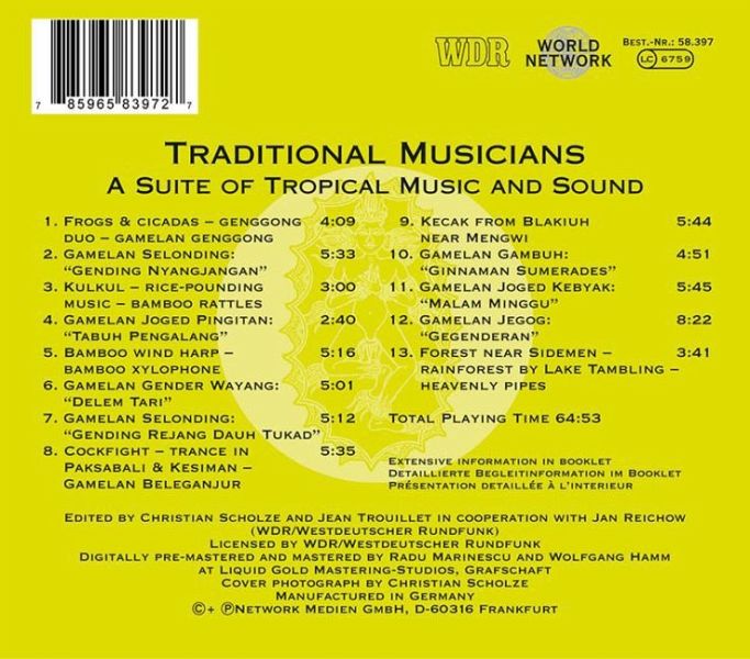 Als Früchte einer Aufnahmereise des WDR präsentiert die CD Raritäten von dieser schönen und kulturell reichen Insel: mitternächtliche Konzerte der Zikaden und Frösche in den Reisfeldern, hypnotische Klänge der Prozessionsmusik, Flöten- und Maultrommelmusik, das suggestive Stimmentheater des Schattenspiels "Wayang Kulit" und den berühmten Ketchak.