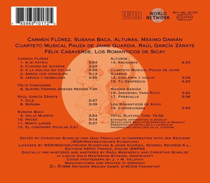 Die kontrastreiche Geographie Perus, die Vielfalt seines bunten Völkergemischs und seiner Geschichte spiegeln sich in einer facettenreichen Musik wider. Die berühmtesten Musiker des Landes geben einen umfassenden Einblick, dargebracht auf einer Fülle von Saiteninstrumenten, Flöten und Perkussionen und von großartigen Sängerinnen.