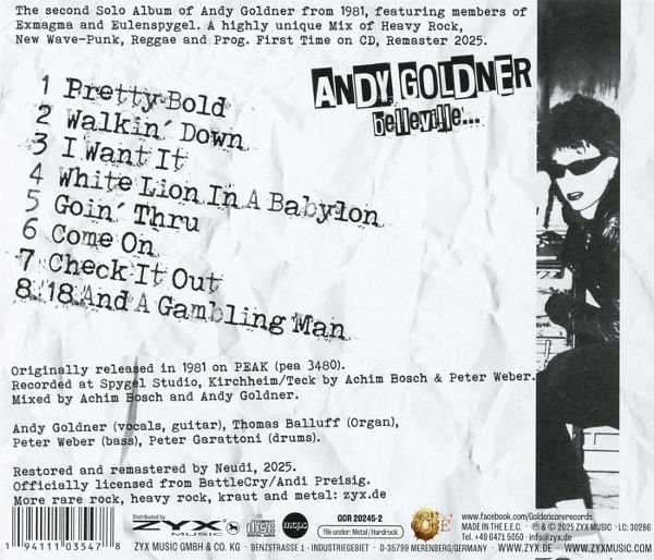 -erstmals auf CD, das Kultalbum aus dem Jahr 1981 -mit Mitgliedern von Exmagma und Eulenspygel -eine musikalische Mischung, wie man sie NUR auf diesem Album findet -Remaster 2025, Booklet mit Liner Notes, Fotos und Memorabilia Andy Goldner (aka. Andy Göldner) ist noch heute ein wichtiger Teil der Musikszene im Raum Stuttgart. Er startete als Mitglied der Stuttgarter Band The Five-Fold (1965-1969). Musikalisch geprägt waren sie von Beat und Pop, sowie der Musik von Jimmy Hendrix. Zusätzlich war Andy Goldner Mitglied der Bands Muli & The Misfits, Seelow und natürlich bei Exmagma. Nach einem kurzen Intermezzo mit der Band Yagua gründete er 1977 die erste Andy Goldner Band, mit der er zusammen mit Kraan beim Mini-Woodstock vor 8.000 Leuten im Odenwald spielte. Im selben Jahr wirkte er auf Hellmut Hattler?s LP Bassball mit und ein Jahr später auf dem ersten SoloAlbum Alto von Johannes Alto? Pappert. 1979 veröffentlichte er die erste Solo-LP, die von Conny Plank aufgenommen und produziert wurde. 1980 arbeitete er an seinem zweiten Album Belleville für das deutsche Label Peak (gehört zum GAMA Musikverlag). Neben Goldner (Gesang, Gitarre), ist hier auch sein Bandkollege Tommy Balluf (Orgel) von Exmagma zu hören. Bass und Schlagzeug übernahmen gleich zwei Musiker der Gruppe Eulenspygel, Peter Weber (Bass) und Peter Garattoni. Gemischt wurde die LP von Achim Bosch, der für viele frühe deutsche Rockplatten verantwortlich war. Stilistisch ist Belleville einzigartig, sowohl damals als auch heute. Während vergangene musikalische Pfade von Andy Goldner dem Krautrock oder Prog zuzuordnen sind, mischt er diese Basis (siehe auch die Besetzung) mit dem damals gerade aktuellen New-Wave-Punk, etwas Hardrock und in zwei Fällen sogar Reggea. Dieser Eintopf klingt zu keiner Zeit aufgesetzt oder verkrampft, sondern wirkt natürlich und packend. Dieses Kultalbum gibt es nun erstmals auf CD, natürlich remastert, inklusive Liner Notes von Andy Goldner persönlich. In den Neunzigern war er als Produzent, unter anderem für Helga Pictures, tätig und legte einen weiteren Fokus auf Filmmusik.