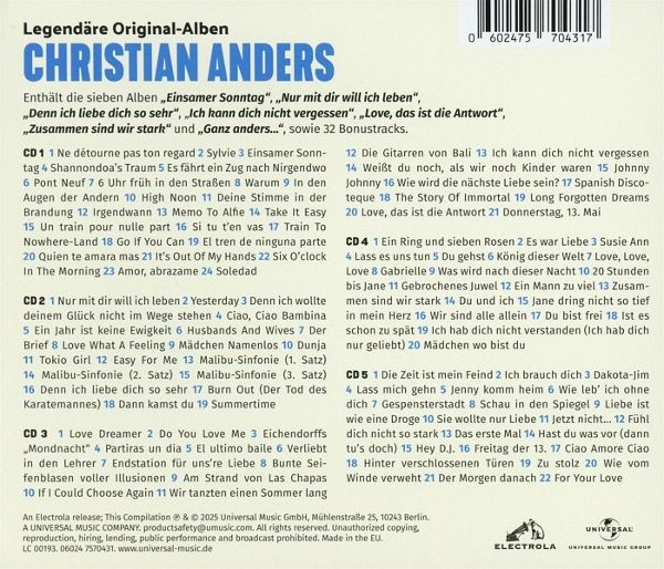 Das musikalische Multitalent Christian Anders war in den 1970er Jahren Stammgast in den Hitparaden. Nach der vor zehn Jahren erschienenen 'Originale Album-Box', die längst zu einem gesuchten Sammlerstück geworden ist, legt Electrola jetzt zu seinem 80. Geburtstag eine BIG BOX nach, die alle späteren Aufnahmen des Künstlers versammelt. Mit der BIG BOX kann man die künstlerische Weiterentwicklung Christian Anders? in den 1970er und 1980er Jahren nachverfolgen, anhand legendärer Alben und rarer Singles. Neben typischen Anders-Schlagern ist er hier auch als Komponist und Dirigent orchestraler Instrumentaltracks und sogar einer Sinfonie zu hören. Im Bonusmaterial finden sich spanische, französische und englische Cover-Versionen seiner großen Hits. Die 5-CD-Box enthält die Alben 'Einsamer Sonntag' (1972), 'Nur mit dir will ich leben' (1976), 'Denn ich liebe dich so sehr' (1977), 'Ich kann dich nicht vergessen' (1978), 'Love, das ist die Antwort' (1978), 'Zusammen sind wir stark' (1982) und 'Ganz anders...' (1983), sowie 32 Single-Bonustracks. Alle Aufnahmen wurden digital remastert, im Booklet finden sich neben einem Einführungstext alle Coverabbildungen sowie diskografische Angaben.