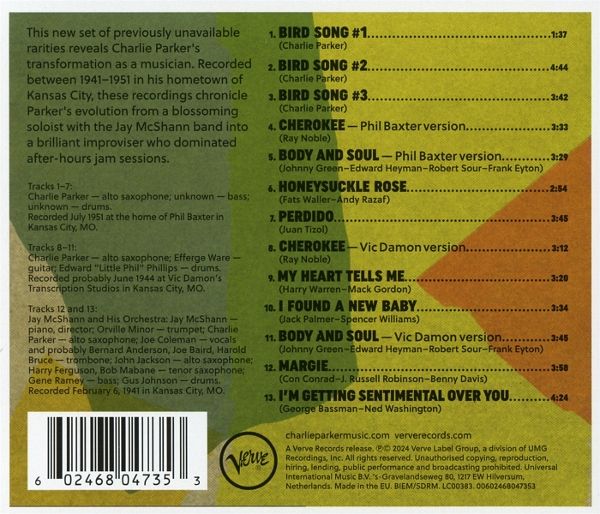 Charlie Parker ist neben John Coltrane nicht nur einer der bedeutendsten Saxofonisten des Jazz, sondern auch einer der stilprägendsten Musiker der Neuzeit überhaupt. Die Aufnahmen aus der kurzen Schaffensphase Birds zählen zu den wichtigsten Dokumenten des Jazz, die Entdeckung unveröffentlichter Parker-Aufnahmen gilt stets als Sensation. Daher dürften auch diese aus den Jahren 1941-1951 ein großes Echo auslösen. Die meisten davon waren noch nie zuvor zu hören und von einigen war unbekannt, dass sie überhaupt existieren. Zusätzlich zu zwei unveröffentlichten 78er-Singles mit der Jay-McShann-Band sind hier zwei private ParkerSessions zu hören, die im Haus seines Freundes Phil Baxter und im Studio von Vic Damon entstanden. Für alle Freunde des klassischen Jazz ist diese Veröffentlichung als LP (140g-Pressung im Singlesleeve mit ausführlichen Linernotes) und CD (Jewelbox, 8-seitiges Bpooklet) unverzichtbar.