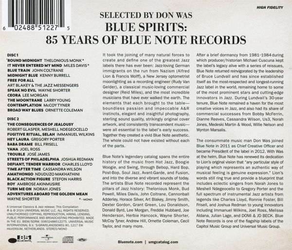 Zum 85ten Blue-Note-Jubiläum hat Labelchef Don Was für Universal Music Japan eine Doppel-CD mit alten und neuen Klassikern des Labels zusammengestellt. Im klassischen Blue-Note-Design und mit ObiStrip a?la Japan ist Blue Spirits ein Hörvergnügen für alte und neue Fans, und ein Sammlerstück nicht zuletzt wegen der Texte von Don Was und dem japanischen Jazz-Kritiker Mitsutaka Nagira.