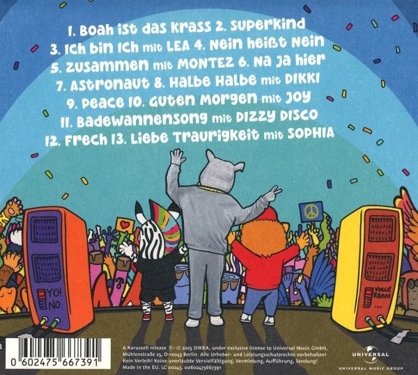 Das 4. Album des rappenden Nashorn DIKKA kommt mit Ansage: 'BOAH ist das krass!' Extra large und doch weiterhin klein und frech: DIKKA ist längst einer der absoluten Superstars der deutschsprachigen Kindermusik. Nichtsdestotrotz bewahrt sich der Dickhäuter aus dem Berliner Zoo auf 'BOAH ist das krass' das Schelmische und ist nie um einen flotten Spruch oder coolen Reim verlegen. Aber mehr denn je hört man die Verantwortung heraus, die mittlerweile auf den Nashornschultern liegt: DIKKAs viertes Album ist geprägt von Songs über große Emotionen (Freude, Zuneigung, Traurigkeit und Wut) und Liedern über Zusammenhalt und Frieden. Unterstützung erhält das Reimnozeros dabei von SOPHIA, Montez, Joy Denalane, Dizzy Disco und LEA. Mit Letzterer gelang DIKKA bereits auf seinem ersten Album 'OH YEAH' einer der herausragendsten Kindermusik-Songs der vergangenen Jahre, 'Bis zum Mond'. Mit 'Ich bin ich' liefert das eingespielte Duo nun einen waschechten Hit mit starker Message, der nicht nur Kinderherzen höher schlagen lässt. 'So wichtig!' lautet das Eltern-Feedback auf die vorab ausgekoppelten Singles - 'so gut!' dürfte das Kinder-Fazit auf das ganze Album ausfallen.