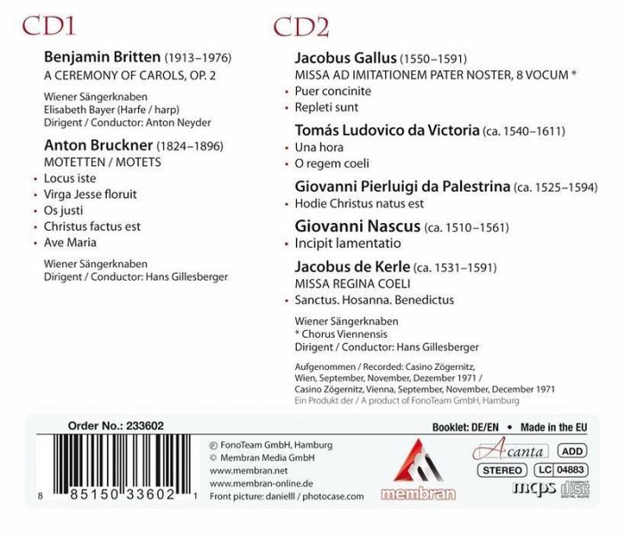 Die Wiener Sängerknaben sind der bekannteste und berühmteste Knabenchor weltweit und haben eine mehr als 500-jährige Geschichte aufzuweisen. Viele berühmte Komponisten (z.B. Gluck, Mozart und Bruckner) musizierten mit den Sängerknaben, Franz Schubert war selbst Sängerknabe. Heute gibt es rund 100 Wiener Sängerknaben, aufgeteilt in vier Konzertchöre. Diese Chöre geben rund 300 Konzerte jährlich weltweit. Dabei reicht das Repertoire vom Mittelalter bis zur Gegenwart, von klassischer Chormusik bis hin zu Pop- und Filmmusik. Auf dieser Doppel-CD präsentieren die Wiener Sängerknaben ein abwechslungsreiches Programm mit Werken aus der italienischen Renaissance, deutschen Romantik und englischer klassischer Moderne und beweisen damit einmal mehr ihr Können und ihre Stilsicherheit.