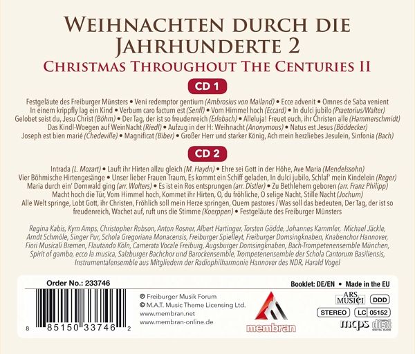 Weihnachten durch die Jahrhunderte hier die Fortsetzung einer in 2012 begonnenen Art kleiner musikalischer Kulturgeschichte (Die erste Folge hat die Bestellnummer 233592). Auch diesmal bietet die Auswahl einige Überraschungen, die sich zuweilen weitab vom Mainstream gängiger Weihnachtslieder bewegen. Das beginnt z.B. mit dem wohl ältesten Weihnachtsgesang, der aus christlicher Zeit überliefert ist, dem Hymnus Veni redemptor gentium des Ambrosius von Mailand aus dem 4. Jahrhundert. Oder das Verbum caro factum est des Komponisten Ludwig Senffl ist in der hervorragenden, klanglich ausgereiften Interpretation der Singer Pur zu hören. Dann wieder erklingt ein Kindlein-Wiegen im wahrsten Sinne des Wortes mit Pauken und Trompeten in österreichischer Tradition barocker Aufzüge. Ein altes französisches Weihnachtslied wird in Gegenüberstellung des traditionellen Gesanges und der barocken Fassung (Joseph est bien marié) dargeboten. Magnificat und weihnachtliche Kantaten sind ebenso vertreten wie die Pastoralmusik (Sinfonia) aus Bachs Weihnachtsoratorium. Aber auch die Freunde des traditionellen Weihnachtsliedes kommen nicht zu kurz. In diffizilen und anspruchsvollen, zuweilen auch sehr prachtvollen Arrangements von Komponisten und Arrangeuren des 19. und 20. Jahrhunderts darf sich der Hörer auf beliebte Weihnachtslieder freuen. Es gibt viel zu entdecken auf dieser weihnachtlichen Reise durch die Zeiten.