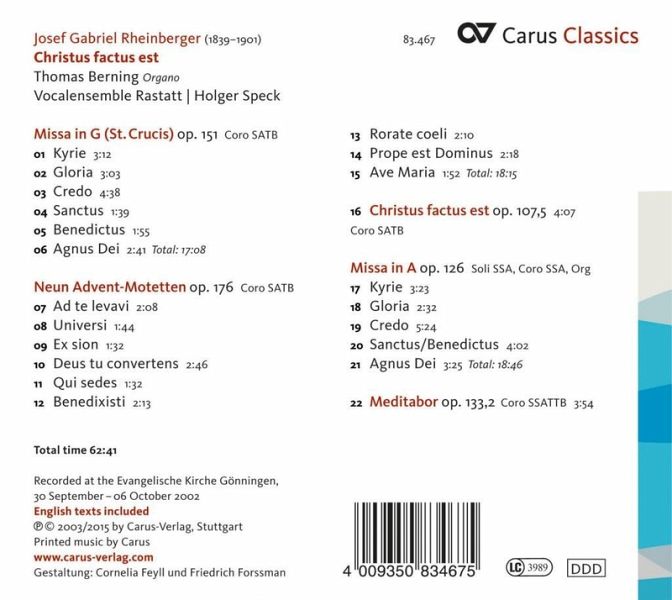 Diese Produktion enthält Einspielungen von zwei häufig aufgeführten und beliebten Messen Rheinbergers: Es handelt sich um die Missa St. Crucis Op.151 - weitgehend homophon komponiert mit sanglichen, einprägsamen Motiven - und die klangschöne Messe Op.126 für Frauenchor und Orgel. Weiterer Höhepunkt sind die Advent-Motetten, ein zentrales Spätwerk des bayerischen Hofkapellmeisters.