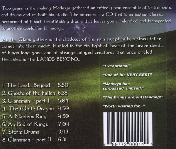 Letzter Teil der keltischen Clan Trilogie. Mit einem komplett neuen Instrumentarium nimmt uns Medwyn auf eine atemberaubende und dramatische Reise in eine andere Welt weit, weit entfernt mit. Wenn die Clans sich im Schatten der verregneten Hügel treffen, gesellt sich ein Geschichtenerzähler zu ihnen ans prasselnde Lagerfeuer und berichtet von den mutigen Taten der Könige aus vergangenen Zeiten und von seltsam geflügelten Kreaturen, die einst die Himmel durchstreiften, in einem Land jenseits des Horizonts...