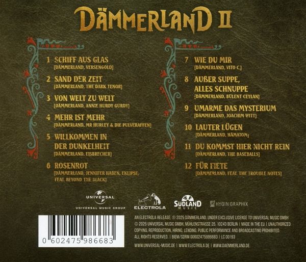 The Saga continues - und der Sensationserfolg auf der Schnittstelle von Fantasy und Musik geht in die zweite Runde: Nachdem Malte Hoyer (Versengold) und Hannes Braun (Kissin' Dynamite) mit ihrem bahnbrechenden 'DÄMMERLAND'-Projekt erst im Herbst 2024 direkt Platz #2 der Offiziellen Deutschen Albumcharts erobern konnten, tauchen die beiden Masterminds gemeinsam mit Annie Hurdy Gurdy und etlichen hochkarätigen Special Guests ab sofort noch tiefer ein ins 'DÄMMERLAND'-Fantasy-Universum: Die Pre-Order für den mit Spannung erwarteten Nachfolger 'DÄMMERLAND 2' startet am 21. März. Wie schon der gefeierte Vorgänger, ist auch 'DÄMMERLAND 2' ein vielschichtiges Fantasy-Erlebnis für Jung und Alt: Illustrierter Fortsetzungsroman, episches Hörbuchabenteuer mit diversen hochkarätigen Special Guests - und nicht zuletzt ein komplettes neues Musikalbum mit 12 brandneuen Kompositionen, aufgenommen mit dem Who-is-Who aus den Bereichen Folk und Singer-Songwriter, Mittelalter-Rock und Metal. Während der zweite Teil des bahnbrechenden Projekts die inspirierende Story um den kleinen Fiete und das Dämmerland als Buch und Hörspiel-Highlight für die ganze Familie weiterspinnt, vereint die 1CD-Edition von 'DÄMMERLAND 2' sämtliche Songs aus dem neuen Audio-Abenteuer. Nachdem letztes Mal bereits etliche Gastmusikerinnen und Gastmusiker aus rund 15 befreundeten Bands mitgewirkt haben (u.a. In Extremo, Saltatio Mortis, Subway to Sally, Lord of the Lost...), darf man jetzt schon gespannt sein, wer fürs neue Chapter alles im Studio vorbeigeschaut hat, um mit den Köpfen von Versengold und Kissin' Dynamite die spannende Fantasy-Fortsetzung von 'DÄMMERLAND' zu vertonen. Jetzt die CD-Edition vorbestellen! Im Offiziellen 'DÄMMERLAND'-Onlineshop sind sämtliche Editionen obendrein als erweiterte Bundles erhältlich - jeweils kombiniert mit einer exklusiven 'Magic-Tasse', deren 'DÄMMERLAND'-Design erst bei Wärmeeinwirkung sichtbar wird.