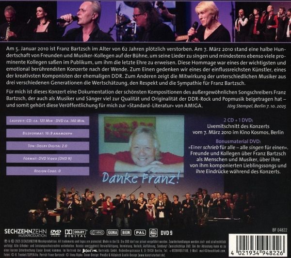 Am 7.11.2025 erscheint die Veröffentlichung der CD/DVD Kombination des Konzerts "Danke Franz - Wind trägt alle Worte fort" - Konzert für Franz Bartzsch. Die DVD war bereits vor 15 Jahren, nach dem Konzert in Berliner Kosmos, an dem fast 50 Musiker aus der ehemaligen DDR beteiligt waren, erschienen - heute erweitert um den Konzertmitschnitt auf Doppel CD. Dieses Konzert ist eine Dokumentation der schönsten Kompositionen des außergewöhnlichen Songschreibers Franz Bartzsch, der auch als Musiker und Sänger viel zur Qualität und Originalität der DDR-Rock und Popmusik beigetragen hat. Diese Hommage an Franz Bartzsch war eines der wichtigsten und emotional berührendsten Konzerte nach der Wende. Sie gehört zur "Standard Literatur" des Amiga Katalogs, Zum Einen gedenken wir eines der einflussreichsten Künstler, eines der kreativsten Komponisten östlich der Elbe. Zum Anderen zeigt die Mitwirkung der unterschiedlichen Musiker aus 3 verschiedenen Generationen die Wertschätzung, den Respekt und die Sympathie für Franz Bartzsch. MIT: Veronika Fischer, Angelika Mann, Dirk Zöllner, IC Falkenberg, Andre Herzberg, Werther Lohse, Wolfgang Lippert, Günther Fischer, Dina Straat, Tino Eisbrenner, muSix, Andreas Bicking, Christiane Ufholz, Ulrike Weidemüller, Sinja Bartzsch, Carmen Oleak, Eberhard Klunker, Ute Freudenberg