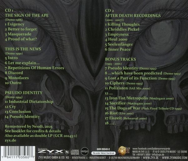-erste CD- und Vinylversion der Studiodemos von MEGACE -aufwändig restauriert und re-/gemastert von den bestmöglichen Quellen -LP enthält die vier hochgelobten Studiodemos, die CD enthält noch weiteres Material -Liner Notes, viele rare Fotos und Abbildungen Ende der Achtziger hatte sich Thrash Metal auch in Deutschland etabliert und spielte weltweit sogar eine führende Rolle. Bereits zu dieser Zeit war es einigen Bands nicht mehr genug, einfach nur schnell und aggressiv zu spielen. Der Thrash Metal wurde in vielen Fällen anspruchsvoller und technischer. In den USA trieben das Watchtower auf die Spitze, in Deutschland folgten gleich mehrere Bands auf dem Aaarrg-Records Label (Mekong Delta, Target). Während andere Acts erst noch straight agierten und dann im Verlauf ihrer Karriere mit progressiven Elementen liebäugelten (Holy Moses, Deathrow, Destruction), schnürten die Hamburger MEGACE schon nach der Bandgründung 1988 ein anspruchsvolles Paket aus anspruchsvollem Thrash und Prog. Mit der Sängerin Melanie Bock hatte man zudem ein besonderes As im Ärmel, denn sie kann Beides: Das kehlige Thrash-Shouting und melodischen Gesang. Das hob MEGACE direkt von anderen Bands ab, was ihnen direkt eine Chance bot, die auch genutzt wurden. Nach einigen Demotapes erschien das Debütalbum Human Errors, welches in der Presse durchweg gelobt wurde und auch heute noch Fans auf der ganzen Welt hat (Reissue auf CD und LP, Golden Core 2025). Das zweite Album Inner War kam mit Verspätung im Jahr 1999 auf dem kleinen Label Angular (Sylvan, Vanishing Point, Lana Lane). Doch ebenso beliebt wie die beiden Alben sind die ersten drei Demotapes, die damals auch als Kassetten im Umlauf waren: The Sign Of The Ape, This Is The News und Pseudo Identiry. Nach dem zweiten Album erschien noch das weniger bekannte Tape After Death, welches hier auch erstmalig zu hören ist. Das gesamte Material wurde in monatelanger Arbeit restauriert & ge- oder remastert und steht den beiden Alben auch klanglich in nichts nach. Die CD-Version enthält noch weitere unveröffentlichte Aufnahmen. Viele Fotos und Abbildungen, sowie Liner Notes, runden ein perfektes Produkt ab. Darauf haben sehr viele Metalfans jahrelang gewartet