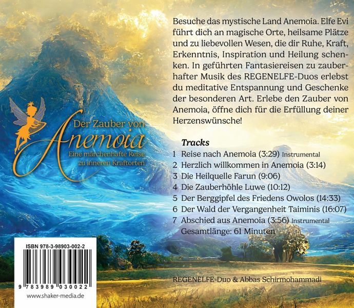 Besuche das mystische Land Anemoia. Elfe Evi führt dich an magische Orte, heilsame Plätze und zu liebevollen Wesen, die dir Ruhe, Kraft, Erkenntnis, Inspiration und Heilung schenken. In geführten Fantasiereisen zu zauberhafter Musik des REGENELFE-Duos erlebst du meditative Entspannung und Geschenke der besonderen Art. Erlebe den Zauber von Anemoia, öffne dich für die Erfüllung deiner Herzenswünsche! Die Heilquelle Farun, die Zauberhöhle Luwe, der Berggipfel des Friedens Owolos und der Wald der Vergangenheit Taiminis erwarten dich.