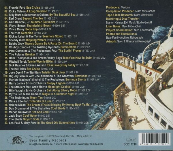 1-CD mit 24-seitigem Booklet, 33 Einzeltitel. Gesamtspielzeit ca. 79:00 Min. ? Von der Kreuzfahrt im Sommer träumen! Ein Sommerspektakel aus dem Hause Bear Family Records®! ? Extravagante Zusammenstellung mit Rock 'n' Roll, Rhythm 'n' Blues, Jazz, Pop und Instrumentals aus den Jahren 1955-1964! ? Eine nostalgische Kreuzfahrt mit 33 musikalischen Juwelen vergangener Tage zum Thema Sommer, Sonne und ... das Meer! ? Mit dabei die Hit-Version des Frankie-Ford-Klassikers Sea Cruise, der Blockbuster Sail Along Silv'ry Moon von Billy Vaughn, Rockabilly-Kracher von Ricky Nelson, Floyd Brown, Marvin Rainwater und Jack Scott. ? Italienisches Flair liefert Minas Klassiker Tintarella di Luna, während Joey Dee an der Reling twistet - manche Aufnahmen erstmals auf CD! ? Hintergründe werden im 24-seitigen farbigen Booklet mit vielen seltenen Bildern und Erinnerungen beschrieben.