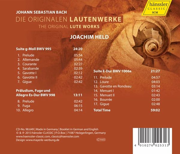 Schon immer gab es kontroverse Ansichten darüber, ob die Lautenwerke des Thomaskantors wirklich für die Laute gedacht waren. Sie galten als unspielbar - wie übrigens lange Zeit auch die Sonaten für Violine solo. Die angebliche Unspielbarkeit der genannten Stücke hat dazu geführt, dass sie etwa auf dem Lautenklavier aufgenommen wurden. Aber es geht auch anders: Auf dieser CD bringt der international renommierte Lautenist Joachim Held Bachs originale Lautenwerke auch auf der Laute zum Klingen. Unspielbar? Kaum vorstellbar, denn Bach kannte die Möglichkeiten dieses Instruments sehr genau. In seinem Haus gingen die prominentesten Lautenvirtuosen seiner Zeit ein und aus. Joachim Held erweckt hier die lange vernachlässigten Werke zu neuem Leben.