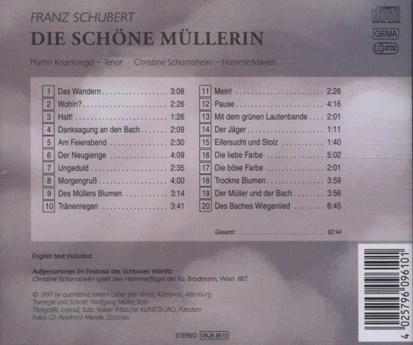 | 1 | Die schöne Müllerin op. 25 D 795 Nr. 1-20 (Liederzyklus nach Gedichten von Wilhelm Müller) | ||