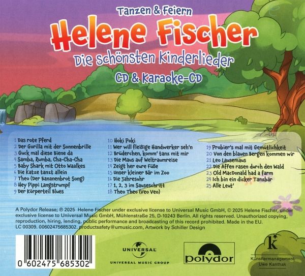 Helene Fischers 'Die schönsten Kinderlieder' hat bereits für magische Momente gesorgt. Nun folgt die Fortsetzung, die zum Tanzen und Feiern einlädt. Diese neue Veröffentlichung aus der Kinderlieder-Serie von Helene Fischer umfasst 25 energiegeladene Titel, die nicht nur Kinder begeistern werden, sondern auch auf jeder Party für gute Stimmung sorgen. Von altbekannten Klassikern bis zu modernen Rhythmen ist für jeden Geschmack etwas dabei. Ein absolutes Highlight dieser Ausgabe ist die exklusive Neuinterpretation des globalen Phänomens 'Baby Shark'! Helene Fischer hat sich für diese besondere Aufnahme mit niemand Geringerem als der Comedy-Legende Otto Waalkes zusammengetan. Freut euch auf eine Version des Milliarden-Hits, die Jung und Alt gleichermaßen zum Mitsingen und Mitfeiern animiert. 'Die schönsten Kinderlieder - Tanzen & Feiern' ist somit das ultimative Album für fröhliche Familienmomente und unvergessliche Partyzeiten!Die 2te CD der Deluxe Edition im Digipack umfasst alle 25 Tanz- und Feier-Songs als Karaoke-Version zum Mitsingen. Alle Songtexte sind im Booklet enthalten.