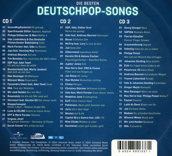 Die Ultimative Chartshow - Die erfolgreichsten Schlager: Die Ultimative Chartshow präsentiert die erfolgreichsten Schlager aller Zeiten auf 3CDs. Angefangen in den 1960er-Jahren bis hin zu aktuellen Titeln von heute. Mit den Hits von Andrea Berg, Kerstin Ott, Howard Carpendale, Maite Kelly, Matthias Reim, Jürgen Drews sowie Marianne Rosenberg, Juliane Werding, Drafi Deutscher, Karel Gott u.v.m. Die Ultimative Chartshow - Die besten Deutschpop-Songs: Die Ultimative Chartshow präsentiert die besten Deutschpop-Songs der letzten Jahrzehnte auf 3CDs. Von den 90ern bis zu aktuellen Titeln von heute. Mit den Hits von Max Giesinger, Bosse, Wir sind Helden, Sido & Mark Forster, Sportfreunde Stiller, AnnenMayKantereit, Udo Lindenberg, Wincent Weiss, 2raumwohnung, Silbermond, Echt u.v.m.