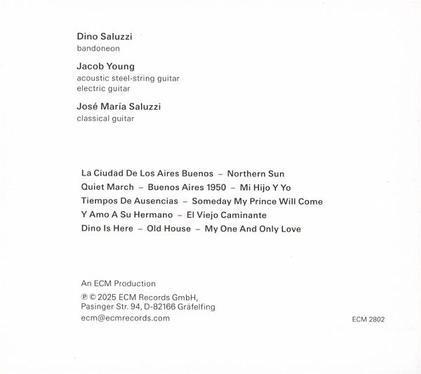 Zwei Gitarren umspielen sanft das einzigartig stimmungsvolle Bandoneon von Dino Saluzzi auf El Viejo Caminante, (?Der alte Wandersmann'). Das argentinische Vater-Sohn-Gespann Dino und José María Saluzzi wird hier von dem Norweger Jacob Young in einem Album voll musikalischer Tiefe und großem Charme unterstützt. "Es erfüllt mich mit Freude", sagt Dino Saluzzi und begeistert sich an der klanglichen Mischung aus José an der klassischen Gitarre und Jacob an der Telecaster und der akustischen Stahlsaitengitarre. "Jacob und José sind ein sehr gutes Team. Sie haben unterschiedliche Klänge, unterschiedliche Visionen, aber wenn es um das künstlerische Ergebnis geht, passiert etwas Wunderbares." Saluzzi senior, der im Mai 90 Jahre alt wurde, hat nichts von seinem jugendlichen Enthusiasmus für die künstlerische Zusammenarbeit oder für das Überschreiten stilistischer Grenzen verloren: "Ich bin immer bestrebt, mit neuen Ideen in Kontakt zu kommen, die außerhalb meines normalen Elements liegen", sagt er und sucht immer noch nach Kontexten, die, wie er es ausdrückt, ?Potenzial für musikalisches und menschliches Wachstum? bieten. Auf dem Programm stehen neue und alte Eigenkompositionen aller drei Musiker, ein Song von Karin Krog sowie einige Standards - Dino versteht das Album als eine Sammlung von Musik aus verschiedenen Zeiten und Orten, die Tango, argentinische Volksmusik und Jazz berührt und aus diesen Anspielungen etwas Neues macht.