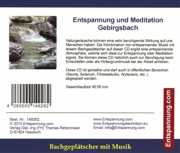 Naturgeräusche können eine sehr beruhigende Wirkung auf uns Menschen haben. Die Kombination von Entspannungsmusik mit leisem Bachgeplätscher eines Gebirgsbaches auf dieser CD ergibt eine entspannende Atmosphäre, welche sich ideal zur Entspannung oder Meditation eignet. Sie können diese CD natürlich auch zur Beruhigung, als Einschlafhilfe oder als gemafreie Hintergrundmusik bei der Arbeit anhören. Diese CD ist gemafrei und darf daher auch in öffentlichen Bereichen (Sauna, Solarium, Fitnessstudio, Arztpraxis, etc.) abgespielt werden (Lizenz wurde auf der Rückseite der CD aufgedruckt).