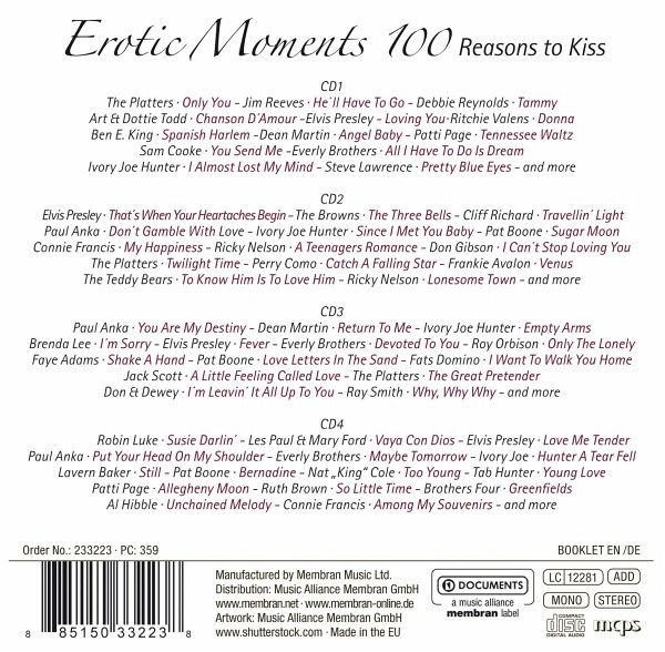 die Welt und wurden in ihrer großen Mehrzahl Evergreens der Popmusik. Mit dieser Ansammlung großartiger und bekannter Schnulzen, kann man (mit etwas Fantasie) einen sehr erotischen Abend einleiten und abschließen. Kaum eine Frau (oder kaum ein Mann) kann sich dem Charme dieser 100 Titel entziehen. Ein wenig Beiwerk ist jedoch unerlässlich: Kerzenlicht und ein guter Tropfen tragen das Nötige zu einem