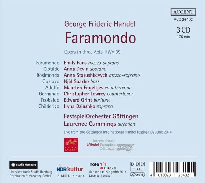 Ende der 1730er Jahre steckte die italienische Oper in London in einer tiefen Krise. Unter dem Desinteresse des Londoner Publikums hatte nicht nur Händels drittes Opernunternehmen zu leiden, sondern auch die konkurrierende Opera of the Nobility: Beide gingen schließlich 1737 bankrott. Für Händel bedeutete dies freilich noch nicht das Ende seiner Bühnenkarriere, auch wenn er wegen einer ernsthaften Erkrankung zur Kur nach Aachen musste und darüber hinaus der Tod von Königin Caroline am 20. November dem Musiktheaterbetrieb eine sechswöchige Zwangspause auferlegte. Unter diesen wenig glücklichen Umständen schrieb Händel seinen Faramondo HWV 39, der am 3. Januar 1738 uraufgeführt wurde. Lange wurde das Werk als eine der schwächsten Opern Händels geschmäht, in der sich gleichsam die künstlerische und gesundheitliche Krise Händels manifestieren würde. Dabei straft bereits die herrliche Ouvertüre und im weiteren Verlauf gleich mehrere ausgesprochen inspirierte Arien solche Aussagen Lügen. Trotzdem blieb auch hier das Londoner Publikum aus, das sich längst den leichten, englischsprachigen Ballad Operas von John Gay und Johann Friedrich Lampe zugewandt hatte. Für den zeitgenössischen Musikhistoriker Charles Burney warf dies ein schlechteres Licht auf das Publikum als auf den Komponisten. Die Produktion der Göttinger Händelfestspiele 2014 mit Laurence Cummings war ein gelungenes Plädoyer für das Werk, und die mitreißende Rehabilitation liegt jetzt als CD vor. Kein Zweifel, Faramondo lohnt sich!