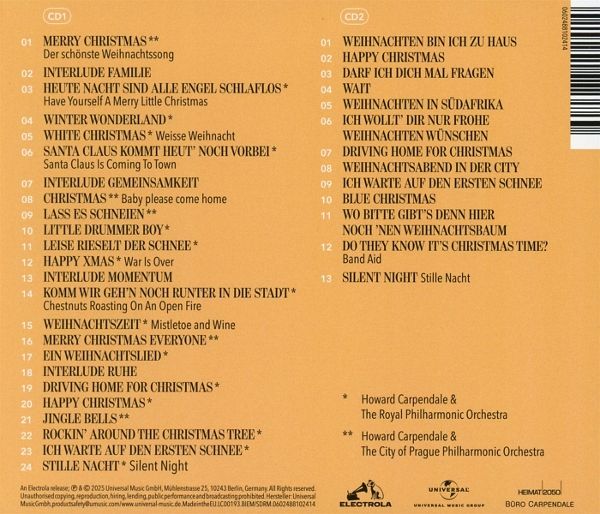 Happy Christmas... Again!' - die erweiterte ReEdition ++ Aufgenommen mit dem Royal Philharmonic Orchestra & dem City of Prague Philharmonic Orchestra ++ ++ Mit fünf zusätzlichen Weihnachtstiteln & vier persönlichen Audiomessages von Howard ++ Erweitert um neue Musik - und persönliche Botschaften zum Jahresausklang: Die kommende ReEdition 'Happy Christmas... Again!' von Howard Carpendale sorgt pünktlich zum ersten Adventswochenende für besinnliche Momente und wunderschön orchestriertes Weihnachtsfeeling. Unter anderem auch als karriereübergreifende Deluxe-Edition (inkl. dem ersten Weihnachtsalbum von 2001!) erhältlich, erscheint die ReEdition in etlichen Konfigurationen und Bundles.