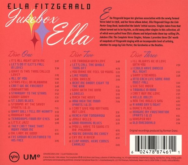 Nach dem Erfolg der ersten Ella-Fitzgerald-Single-Compilation ?Jukebox Ella' legt das Verve-Label nach: weitere 50 Singletracks erscheinen auf CD! Als Verve 2003 die Doppel-CD 'Jukebox Ella' veröffentlichte, waren viele Fans erstaunt, wie viele Singles die 'First Lady Of Jazz' im Laufe ihrer Verve-Karriere veröffentlicht hatte. Die erste Kollektion enthielt sämtliche Ella-Singles, damals nur als Singles erschienen waren. Das war noch nicht alles! Die Ella-Party geht jetzt weiter mit ?Jukebox Ella: The Complete Verve Singles, Volume 2ff. Das 3-CD-Set versammelt alle Ella-Singles, die damals parallel auch auf Alben erschienen, von swingenden Jazz-Klassikern über Blues-Hits wie 'See See Rider' bis hin zu Pop-Songs wie 'Hello, Dolly!' und 'A Hard Day's Night' von den Beatles. 25 Single-A- und B-Seiten, d.h. 50 Tracks und nahezu drei Stunden Musik auf 3 CDs im Digipak mit ausführlichem Booklet.