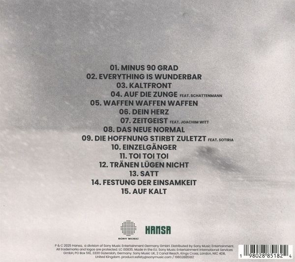 Mit ihrem zehnten Studioalbum "Kaltfront°!" meldet sich die deutsche Rockband Eisbrecher am 14. März 2025 eindrucksvoll zurück. Seit über zwei Jahrzehnten prägt die Formation um Frontmann Alexander "Alexx" Wesselsky die deutsche Rockszene und setzt mit diesem Werk neue Maßstäbe. Die vorherigen Alben "Sturmfahrt" und "Liebe macht Monster" erreichten bereits die Spitze der Charts; mit "Kaltfront°!" strebt die Band an, diesen Erfolg zu übertreffen. Das Album umfasst 15 Tracks, die eine Mischung aus harten Gitarrenriffs, elektronischen Elementen und tiefgründigen Texten bieten. Mit "Kaltfront°!" beweisen Eisbrecher einmal mehr ihre Fähigkeit, gesellschaftskritische Themen mit eingängigen Melodien und kraftvollen Arrangements zu verbinden. Das Album ist ein Muss für alle Fans der härteren deutschsprachigen Rockmusik und zeigt die Band auf dem Höhepunkt ihres kreativen Schaffens.