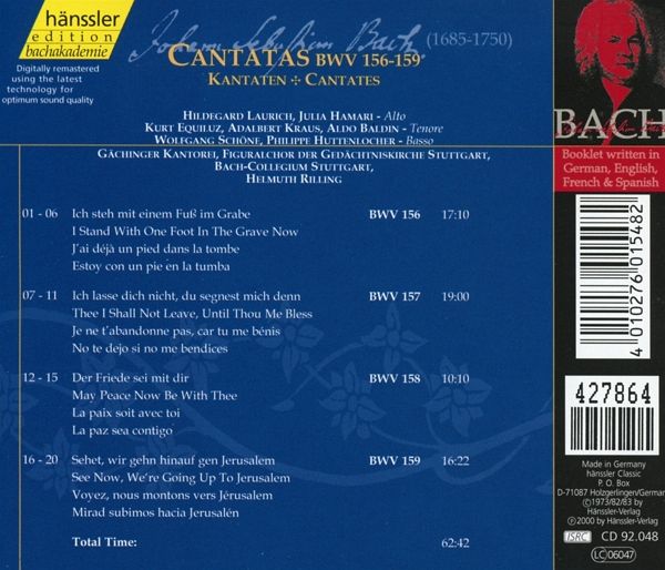 Kantaten BWV 156 - 159 BWV 156 Ich steh mit einem Fuß im Grabe BWV 157 Ich lasse dich nicht, du segnest mich denn BWV 158 Der Friede sei mit dir BWV 159 Sehet, wir gehn hinauf gen Jerusalem Im Jahr 1970 begann Helmut Rilling mit seinen Ensembles wenig bekannte Kantaten Johann Sebastian Bachs für die Schallplatte aufzunehmen. Aus diesem Unternehmen entwickelte sich bis zum Vorabend von Bachs 300. Geburtstag im Jahre 1985 die erste und bis heute einzige Gesamtaufnahme des Bachschen Kantatenwerks. Die künstlerische Leistung Helmut Rillings und die editorische des Hänssler Verlags wurden sogleich mit dem "Grand Prix du Disque" ausgezeichnet. Das Kennenlernen des musikalischen Kosmos von Bach bezeichnet Rilling heute als wichtigsten Lernprozess seines Lebens. "Nur wer Bachs Kantaten kennt, kann behaupten, Bach wirklich zu kennen."