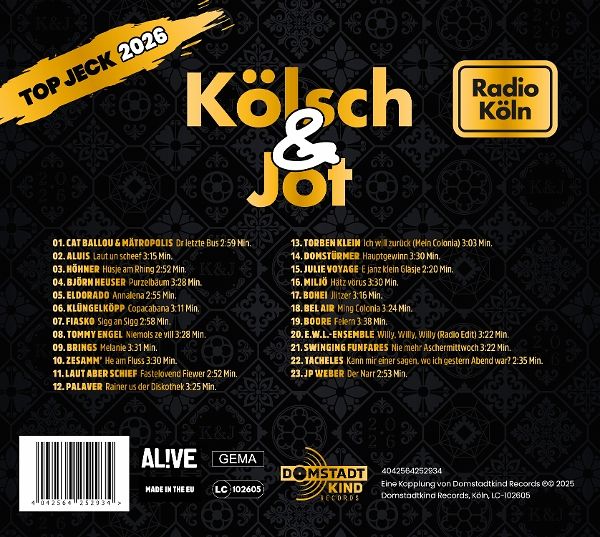 Top Jeck 2026 - Kölsch & Jot: Legenden treffen Nachwuchs Die 8. Ausgabe des beliebten Karnevals-Samplers ist mehr als nur Musik - sie ist ein Stück kölsche Lebensfreude. Mit dabei sind die ganz Großen des Karnevals - u.a. Tommy Engel, Höhner, Brings, Cat Balou, Eldorado - die seit Jahren für Gänsehaut, Mitsing-Momente und ausgelassene Stimmung sorgen. Seite an Seite treten sie gemeinsam mit den aufregendsten Newcomern auf, die frischen Wind in die Szene bringen und zeigen, wie vielfältig und lebendig der Fastelovend klingt. Von mitreißenden Party-Hymnen bis hin zu gefühlvollen Balladen - TOP JECK 2026 vereint das volle musikalische Spektrum des rheinischen Karnevals. Jeder Titel ist sorgfältig ausgewählt, um die perfekte Mischung aus Tradition und Moderne zu bieten. Damit wird das Album für echte Jecken zum Muss. Ein Sampler, der neue Lieblingssongs bereithält und überall dort für Karnevalsstimmung sorgt, wo er läuft - ob zu Hause, im Auto oder auf der nächsten Karnevalsparty.