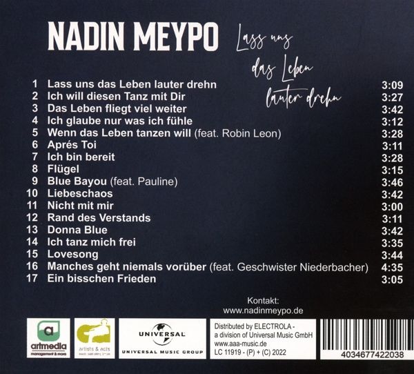 Nadin Meypo legt ihr persönliches Debut-Album auf dem Schlagermarkt vor und schafft es mit ihren sehr persönlichen und emotionsgeladenen Songs in einem trendigen Sounddesign zu überzeugen. Sie zeigt mit diesen Songs wie authentisch sie den Schlager liebt und lebt - insgesamt 17 Tracks hat sie aufgenommen und diese bestätigen ihre Willensstärke, ihr Temperament und vor allen Dingen ihren Optimismus und ihre auffallende Fröhlichkeit