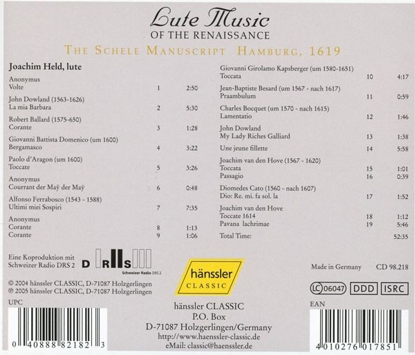 Wenn man bedeutende Lautenisten Revue passieren lässt, dann denkt man zunächst an Hopkinson Smith. Er hat die Laute auch als Solo- und nicht nur als Continuoinstrument etabliert. Aber die Zeit steht nicht still, 60 Jahre alt wird Hopkinson Smith im kommenden Jahr. Unter der nächsten Generation der Lautenisten ist sicherlich Joachim Held einer der führenden Musiker - Schüler von Hopkinson Smith ebenso wie Absolvent der Schola Cantorum Basiliensis (was er mit Paul O'Dette gemeinsam hat). Joachim Helds bisherige Aufnahmen zeigen einen technisch überragenden Lautenisten, der zudem außergewöhnliche Imaginationskraft in die Waagschale wirft. Wie das klingt, das lässt sich sehr schön nachhören auf dieser seiner ersten Aufnahme bei hänssler CLASSIC: Das Tabulaturbuch von Ernst Schele zählt zu den bedeutenden Handschriften für 6- und 11-chörige Laute am Ende der Renaissance, ein viel zitiertes, aber nicht erforschtes Manuskript, das Joachim Held mit seiner Laute zum Leben erweckt. Damit präsentiert er mit dieser CD eine der schönsten Sammlungen bekannter und weniger bekannter Stücke des 16. und frühen 17. Jahrhunderts.