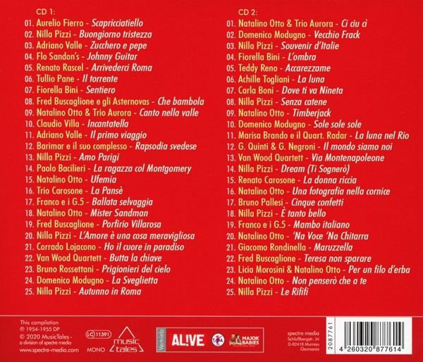 Das Musikjahr 1955 war ein sehr erfolgreiches Jahr für italienische Künstler. Domenico Modugno konnte mit -Vecchio Frack- einen frühen Hit landen. Ebenso erfolgreich wie in Deutschland, England und Frankreich war -Mambo italiano- auch in Italien, hier interpretiert von Franco e i G.5. Nilla Pizzi hatte mit -Buongiorno tristezza-, -Amo Parigi (I Love Paris)-, -L-Amore è una cosa meravigliosa-, -Autunno in Roma-, -Le Rififi- und -Souvenir d-Italie- gleich eine ganze Reihe Hits. Ebenso erfolgreich war 1955 Natalino Otto, der u.a. mit -Ci ciu cì (cantava un usignol)- und -Canto nella valle- in Italien die Hitparaden stürmte. Diese Doppel-CD präsentiert 50 Originalaufnahmen der erfolgreichsten italienischen Titel des Jahres 1955.