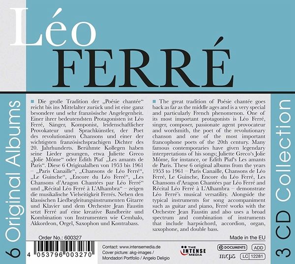 Die große Tradition der "Poésie chantée" reicht bis ins Mittelalter zurück und ist eine ganz besondere und sehr französische Angelegenheit. Einer ihrer bedeutendsten Protagonisten ist Léo Ferré, der Poet des revolutionären Chansons. Viele seiner berühmten Kollegen haben legendäre Interpretationen seiner Lieder gesungen; Juliette Grecos "Jolie Môme" etwa oder Edith Piafs "Les amants de Paris". Der Sänger, Komponist, leidenschaftliche Provokateur und Sprachkünstler ist einer der wichtigsten französischsprachigen Dichter des 20. Jahrhunderts und hat durch seine Übersetzungen und Vertonungen von Versen bedeutender französischer Lyriker wie Villon, Verlaine, Rimbaud, Apollinaire und Aragon der "gesungenen Geschichte" Frankreichs entscheidende Beiträge hinzugefügt. Diese 6 Originalalben von 1953 bis 1961 - "Paris Canaille", "Chansons de Léo Ferré", "Le Guinche", "Encore du Léo Ferré", "Les Chansons dAragon Chantées par Léo Ferré" und "Récital Léo Ferré à LAlhambra" - zeigen die musikalische Vielseitigkeit Ferrés. Neben den klassischen Liedbegleitungsinstrumenten Gitarre und Klavier und dem Orchestre Jean Faustin setzt Ferré auf eine kreative Bandbreite und Kombination von Instrumenten wie Cembalo.