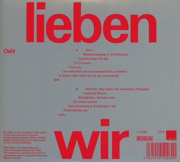 Mit "lieben wir" präsentiert OEHL ein intimes und packendes Konzeptalbum über die Liebe in all ihren Facetten ? von Knutschflecken bis zu den Momenten, die unser Leben prägen. Ariel Oehl wagt Neues und bleibt sich treu: Sein "Gitarrenalbum" vereint handgemachte Klangwelten mit verführerischen Melodien, die zwischen Nostalgie und großer Emotion pendeln. Produzent Niklas Apfel sorgt für ein ausdrucksstarkes, organisches Sounderlebnis.Ein Album, das von Enttäuschungen, Glück und der Magie flüchtiger Augenblicke erzählt ? Musik für Menschen, die etwas von Musik verstehen ? und ein Herz haben.