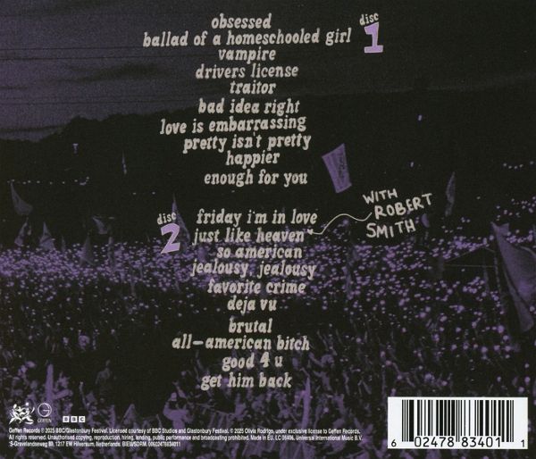 Nach etlichen Meilensteinen hat Olivia Rodrigo 2025 wohl einen ihrer bedeutendsten ihrer Karriere erreicht: Headlinerin beim legendären Glastonbury Festival. Bei ihrem mitreißenden Set holte sie niemand geringeres als The Cure-Frontmann Robert Smith auf die Bühne, um mit ihm zusammen zwei Songs zu performen. Die nun erscheinende 'Live From Glastonbury' LP beinhaltet Olivias gesamtes Glastonbury Set - darunter Titel aus ihren Rekordalben 'SOUR' und 'GUTS' sowie die Live-Version von 'Friday I'm In Love' und 'Just Like Heaven' mit Robert Smith.