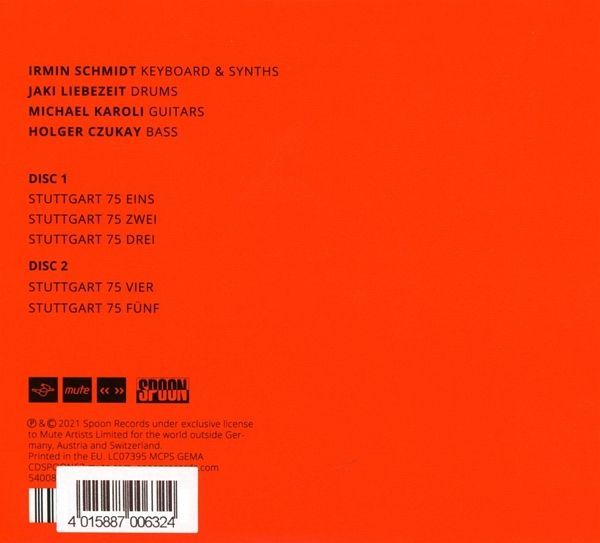Selbst wenn man glaubt Can zu kennen, inklusive aller Alben und den legendären Lost Tapes, gibt es hier immer noch vieles zu entdecken, das einen überrascht. Diese Musik ist nie zweimal derselbe Fluss. Das neue Album in fünf Teilen, Can Live in Stuttgart 1975, dokumentiert einen wichtigen und beeindruckenden Teil der Can-Geschichte. Da in den 70gern technische Pannen immer wieder die geplanten Live-Aufnahmen sabotierten, fehlten diese im Spoon Katalog. Nun wurden die besten Bootleg-Aufnahmen genommen und unter der Leitung von Gründungsmitglied Irmin Schmidt und CAN Produzent/Toningenieur René Tinner durch die Mühlen der Technologie des 21. Jahrhunderts geschickt, um diese wichtigen historischen Dokumente in der bestmöglichen Qualität zu präsentieren. Gegründet 1967 und aufgelöst etwas über ein Jahrzehnt später, hat Can's beispiellose und kühne Verbindung von hypnotischen Grooves und avantgardistischen instrumentalen Texturen sie zu einer der wichtigsten und innovativsten Bands aller Zeiten gemacht. Die neue LIVE Serie offenbart eine völlig neue Perspektive auf die Band. Man kann vertraute Themen, Riffs und Motive hören, die auftauchen und durch die Jams surfen, aber es sind oft nur flüchtig wiedererkannte Gesichter in einer wirbelnden Menge. Man kann aber auch viel Musik entdecken, die es nie in den offiziellen Albumkanon geschafft hat. Die Aufnahmen gehen in extremere Bereiche als Cans Studioarbeit: vom sanften, ambienten Drift-Rock bis hin zu den berühmt berüchtigten "Godzilla"-Momenten. Und auch wenn sich die Band Mitglieder von Minute zu Minute anpassen und dem Rhythmus hinterherjagen, kann man die außergewöhnliche musikalische Telepathie hören, die sie alle teilten.- "Cans Live-Auftritte klingen wie eine epische Geschichte ein Roman, der uns erzählt wird. Mit unterschiedlichen Kapiteln, wechselnden Stimmungen, Jahreszeiten und exotischen Landschaften." - Alan WarnerFormate- 2CD Cardpack/Digisleeve mit 16-seitigem Booklet und ausführlichen Linernotes- Orangene 3LP im Triple Gatefold Sleeve mit 4-seitigem Booklet und ausführlichen Linernotes