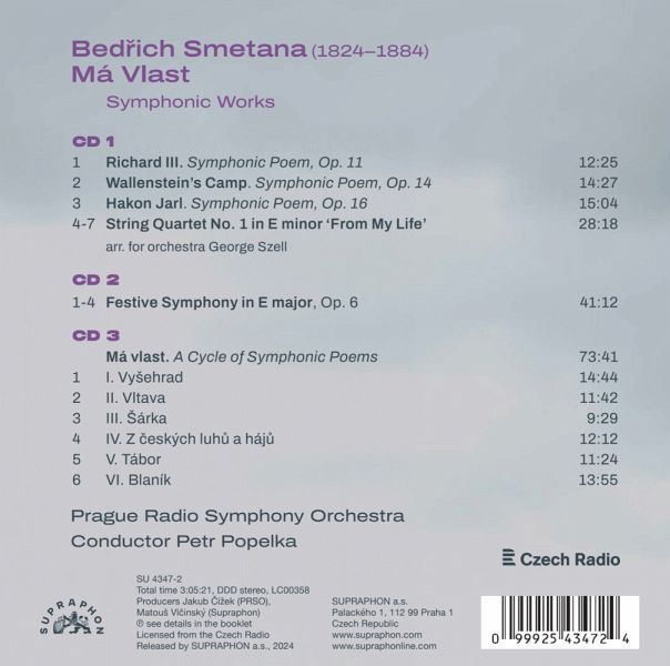 Als Chefdirigent des Prague Radio Symphony Orchestra sowie der Wiener Symphoniker hat sich Petr Popelka längst als einer der aufregendsten jungen Dirigenten weltweit etabliert. Seine Einspielung mit Orchesterwerken Bedrich Smetanas bei SUPRAPHON feiert den 200. Geburtstag des unangefochtenen tschechischen Nationalkomponisten. Neben dem beliebten Zyklus Mein Vaterland erklingen hier auf zwei weiteren CDs auch weniger bekannte Orchesterwerke Smetanas sowie das Streichquartett Nr.1 "Aus meinem Leben" in der brillanten Orchestrierung des großen Dirigenten George Szell.